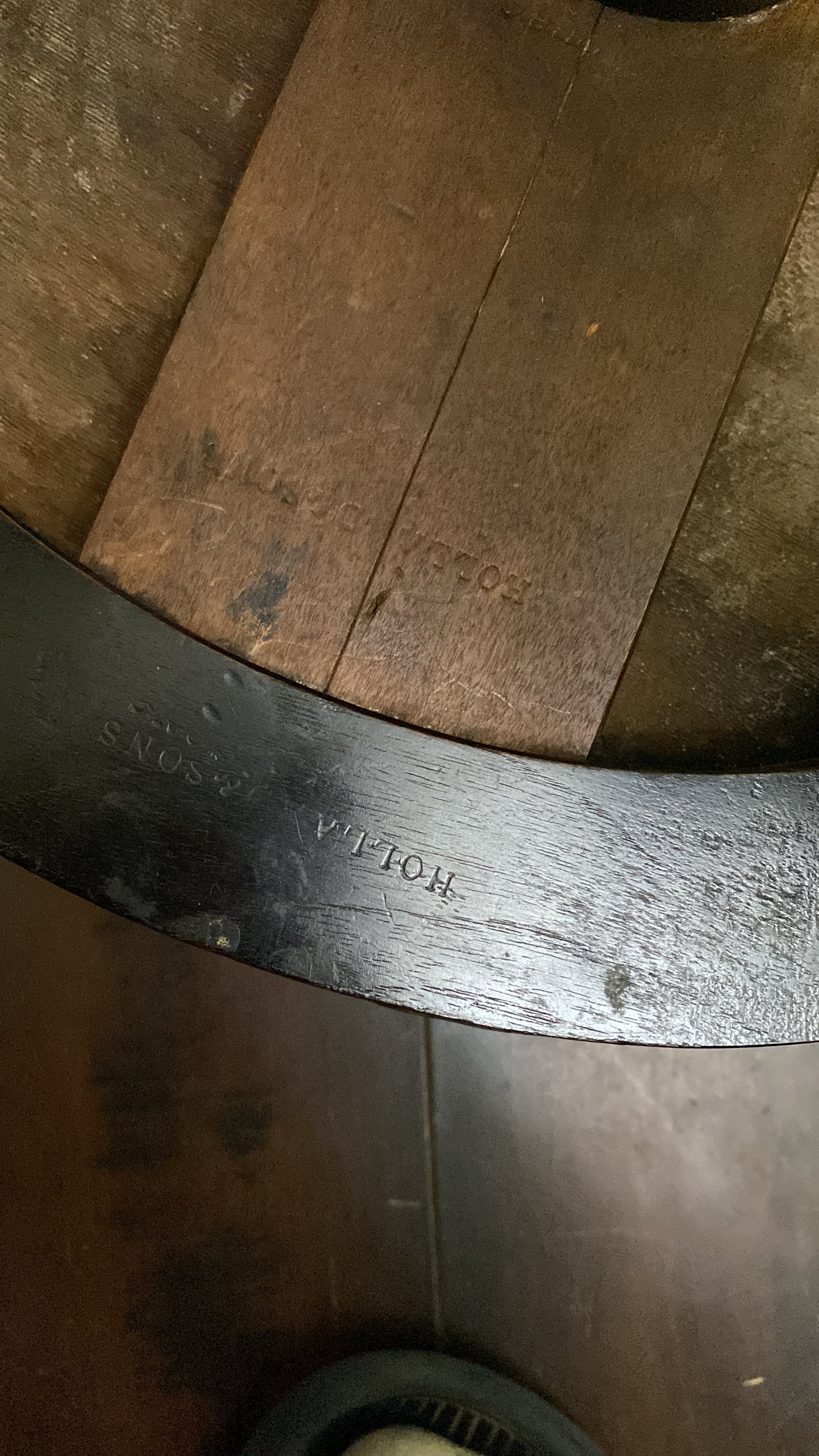 Circa 1870’s with buttoned over-stuffed leather top on reeded supports. Stamped Holland & sons to underside