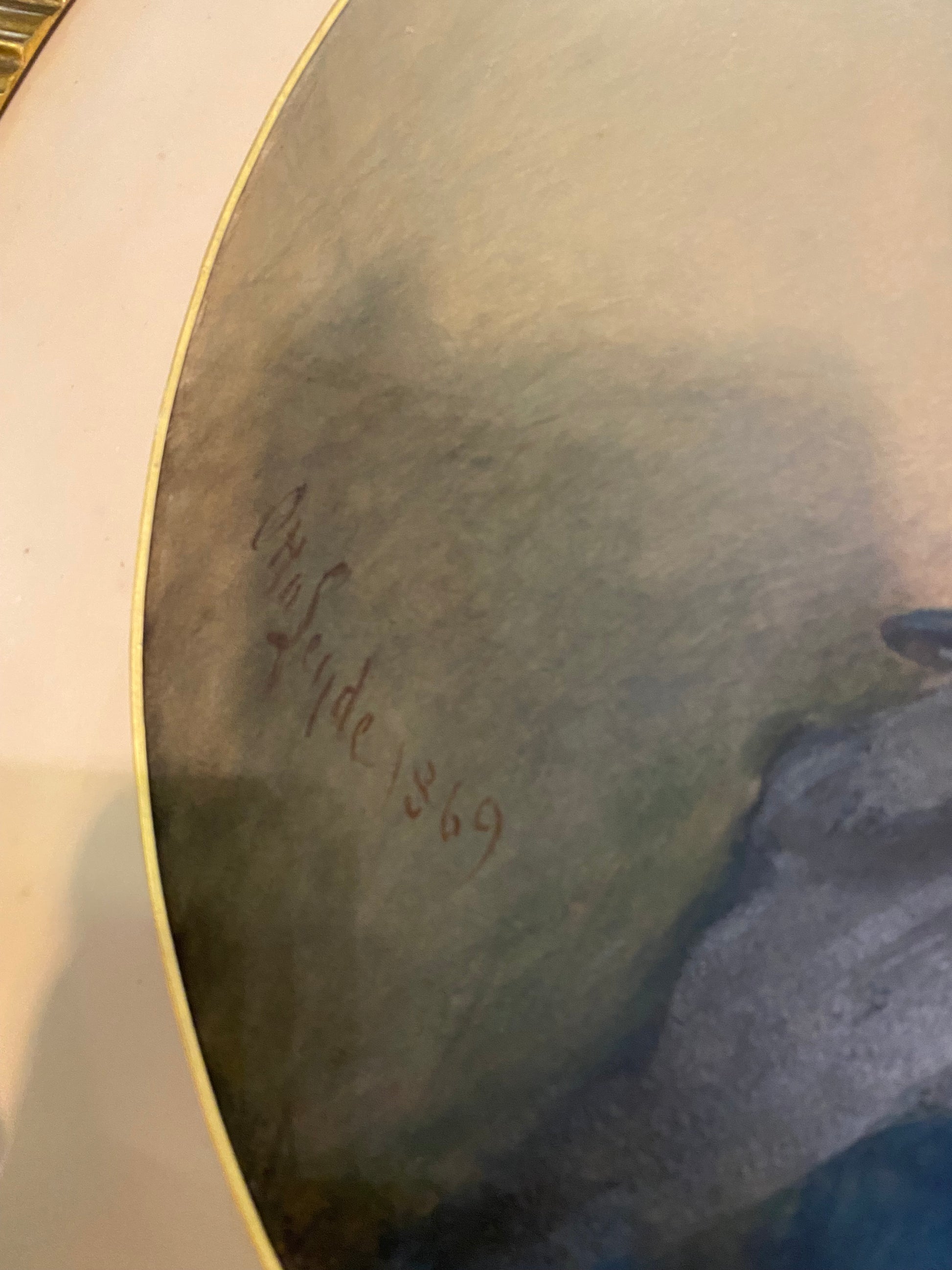 19th century mixed media portrait of a young boy.Signed and dated 1869. Fitted within an antique gilt linen fold style oval frame. [Frame- 73x65cm] - No glass