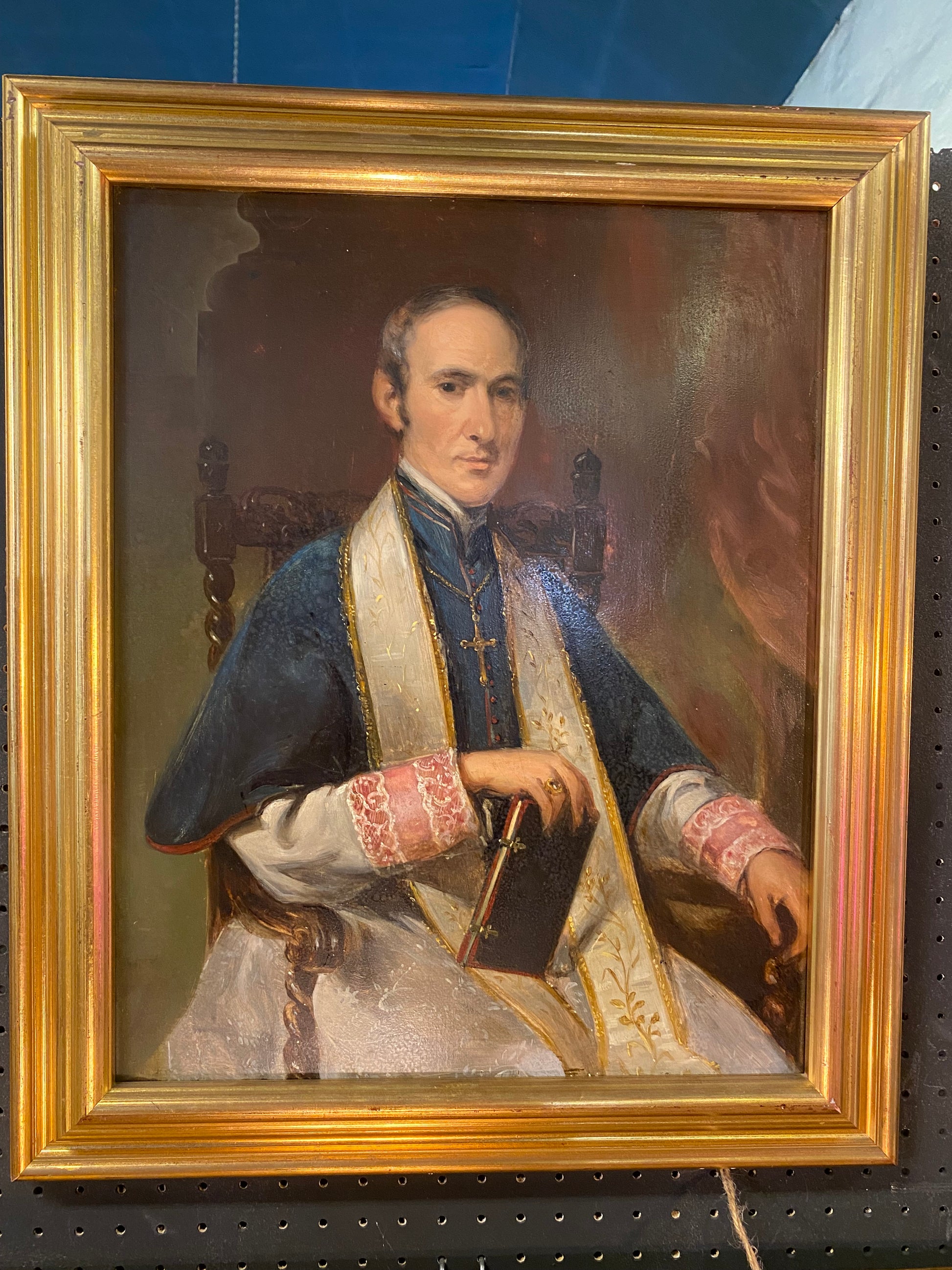A 20th century oil on board portrait of a Bishop. The bishop dressed in his finery and mounted in a gilt frame