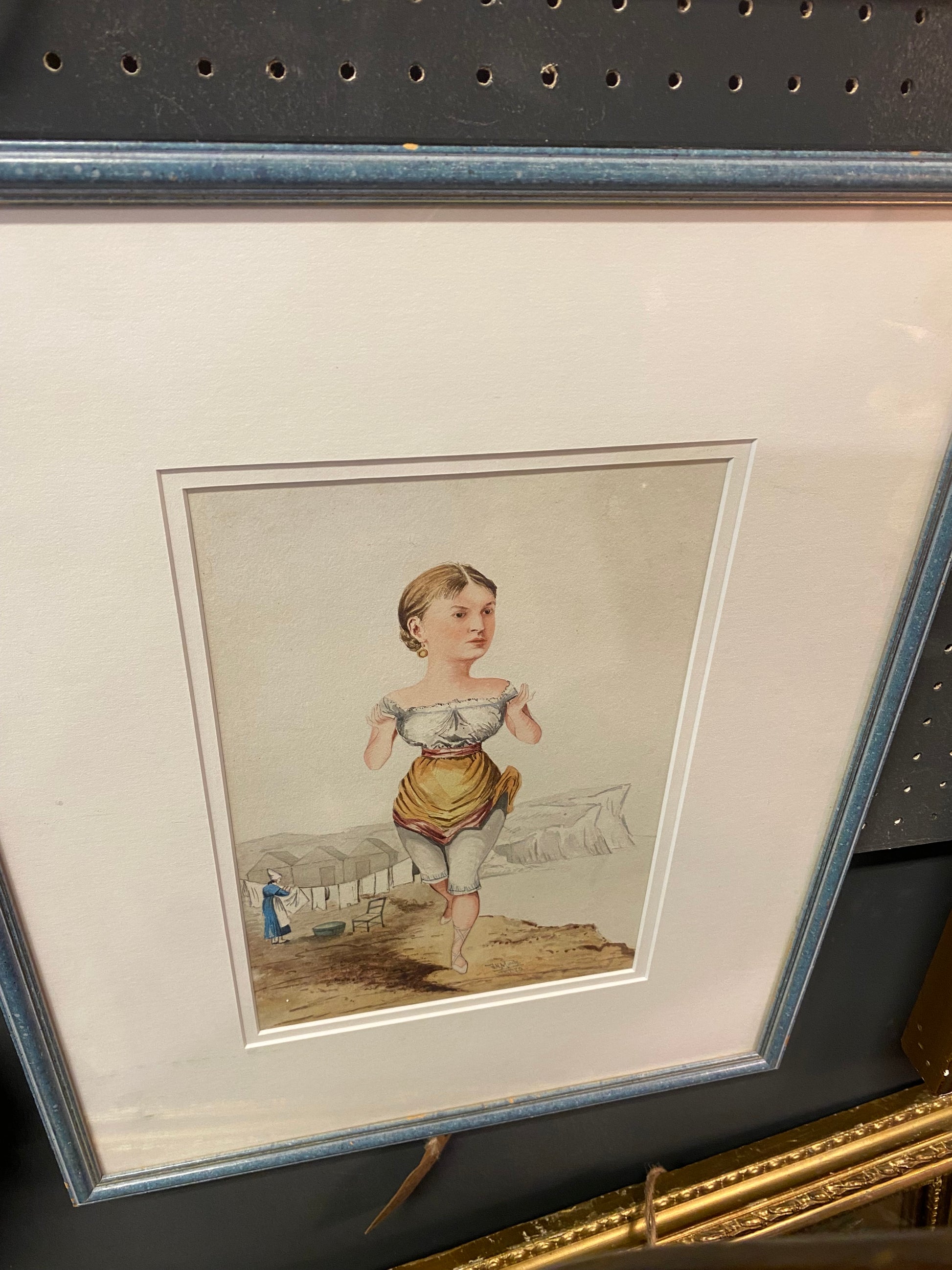 Caricature watercolour of a woman on the beach. Circa 1890 and signed J.H Manby