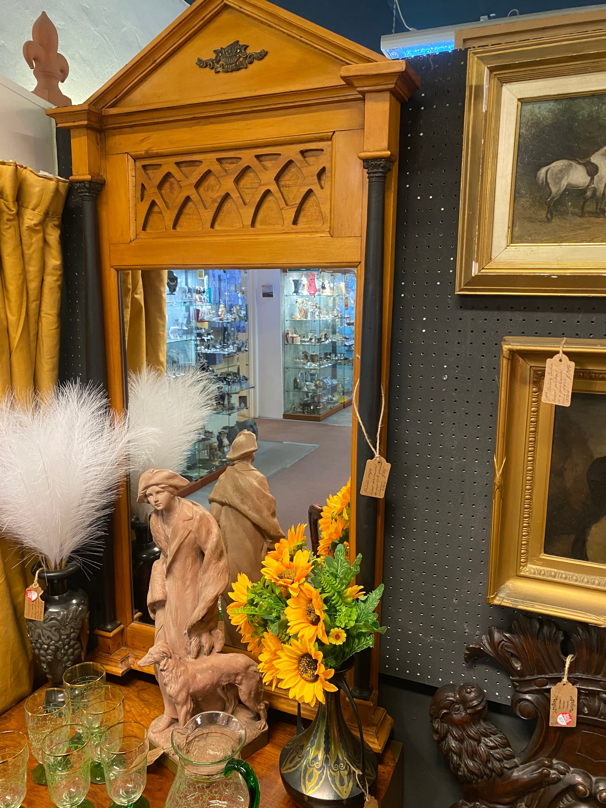 Italian maple over mantle mirror flanked with ebonised columns